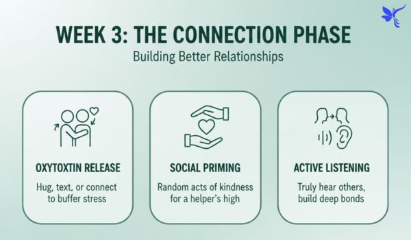 Happiness is not a solo sport. During week three of your Happiness Challenge To Improve Your Mindset, you focus on external energy. Healthy connections act as a mirror for your progress and provide the Oxytocin Release needed for deep resilience.